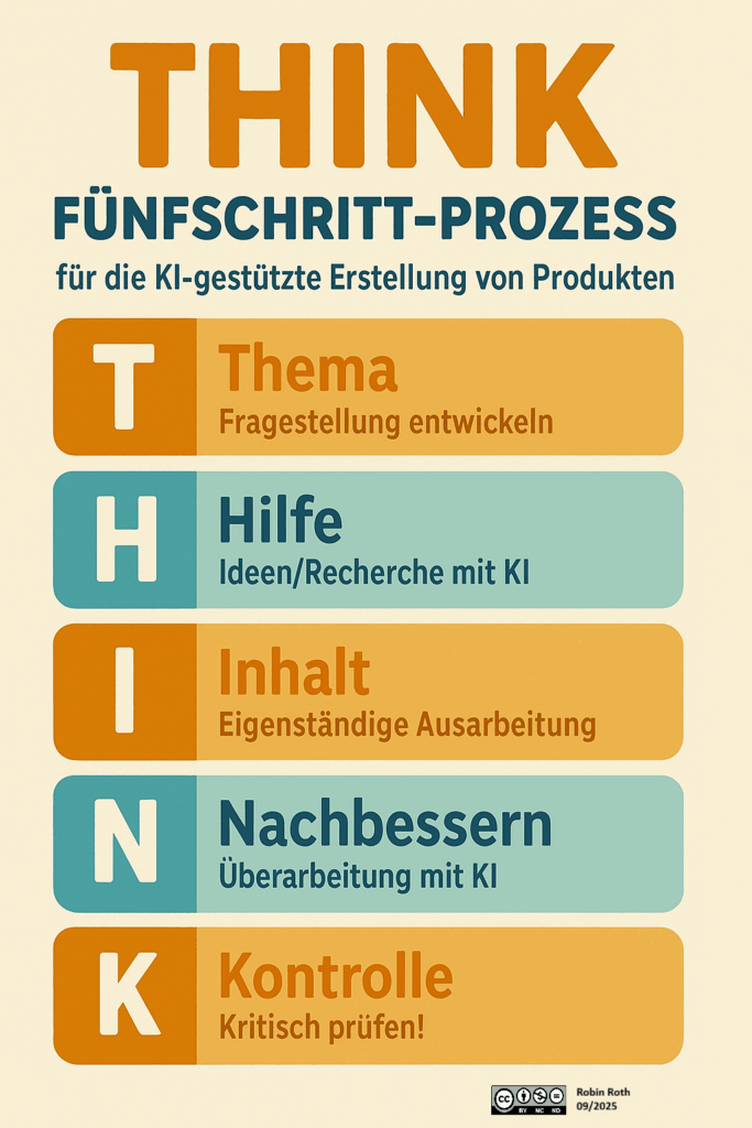 - Nutze KI gezielt, poduktiv und kritisch nach dem THINK-Fünfschritt: